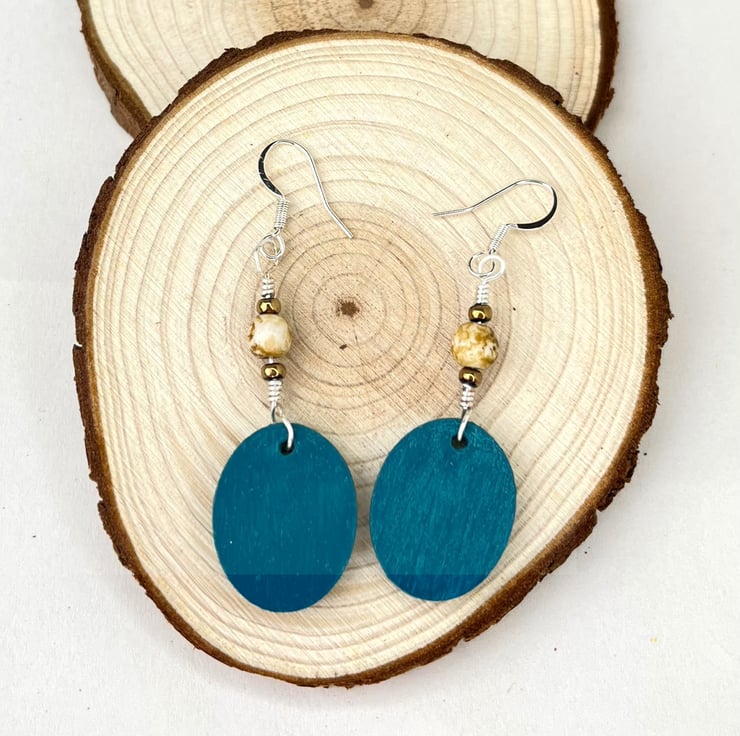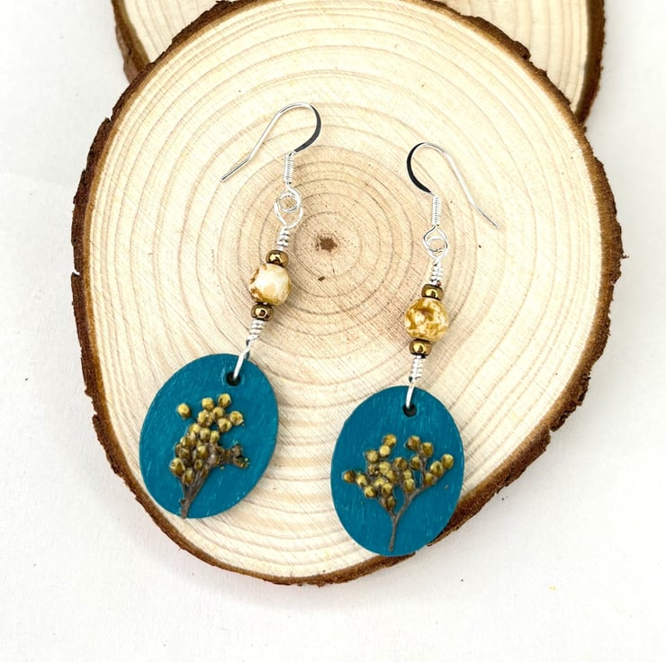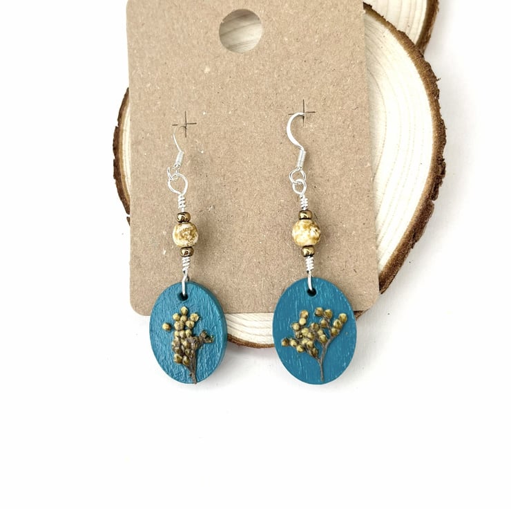 These lovingly handmade dangle earrings are made using hand painted wooden ovals with real pressed meadowsweet foraged a mile from our home. Finished with a water based varnish.