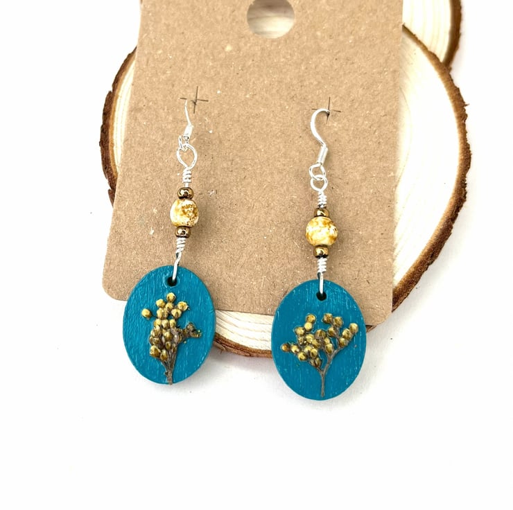 Real Pressed Meadowsweet Dangle Sliver Plated Wood and Bead Earrings