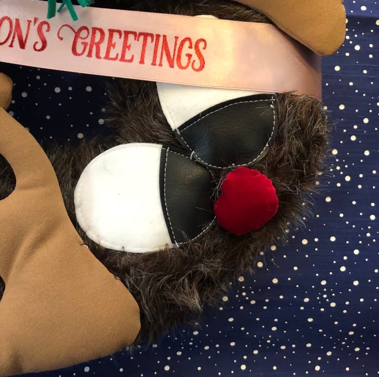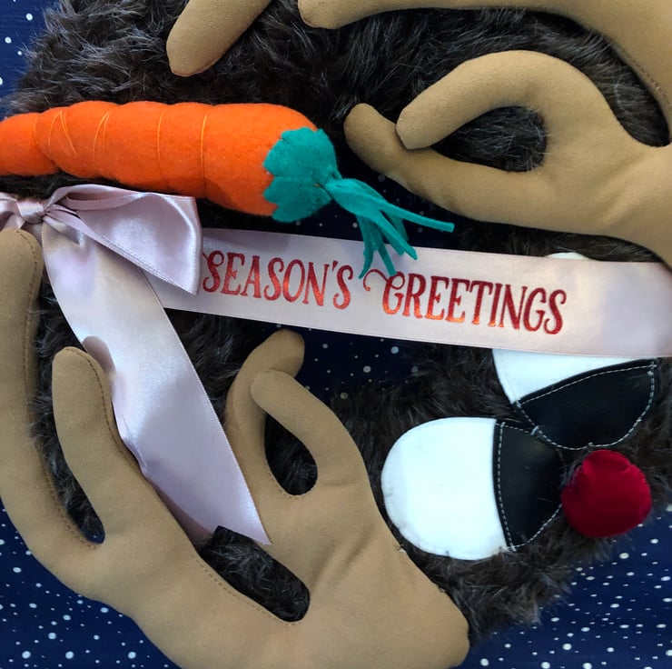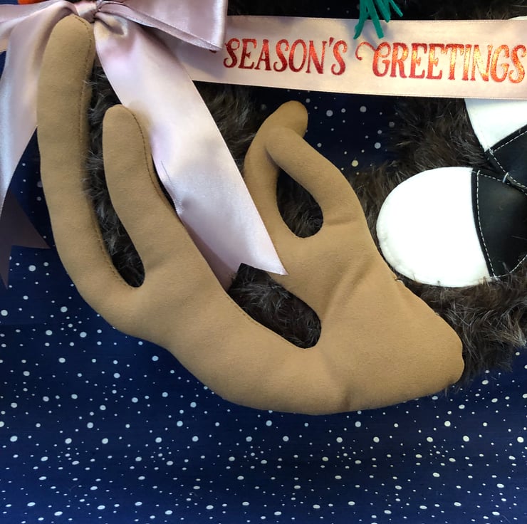 Contains a mini season’s greetings banner as the centrepiece surrounded by reindeer antlers, eyes, a bright red velvet nose and wouldn’t be complete without a felt carrot treat for Rudolph! The components sit on a 12 inch metal frame covered with a brown faux fur base.