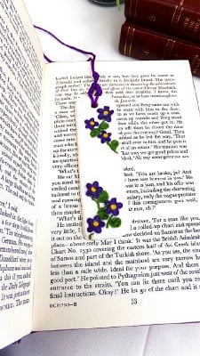 A bookmark that I have handcrafted from polymer clay that features dark purple violets on a ivory cream background and purple silky cord.