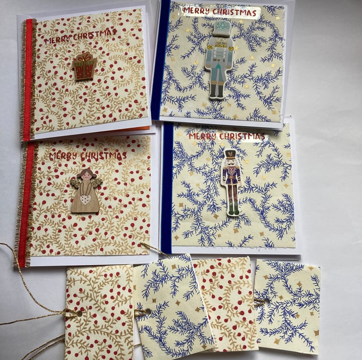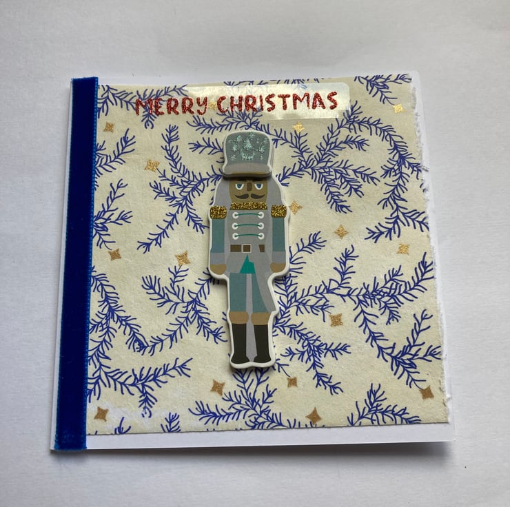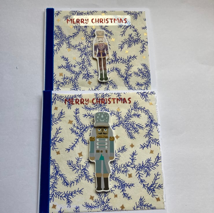 The other 2 cards have a blue leaf and a gold star pattern in the recycled cotton paper. The words in red say MERRY CHRISTMAS and a blue velvet ribbon runs down the folding edge. Both cards have a nutcracker on the front.
