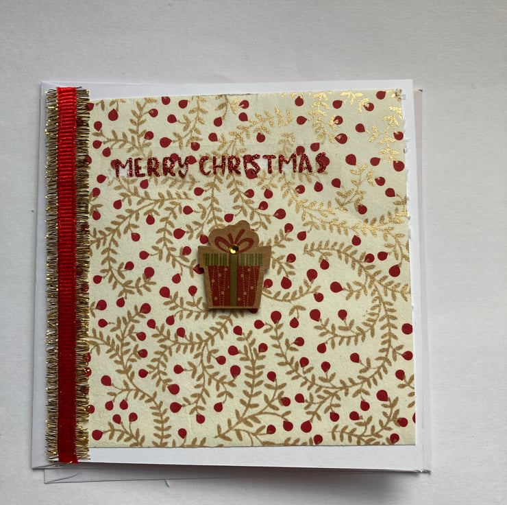 2 cards have a gold leaves and a red berries pattern on recycled cotton paper. The letters in red say MERRY CHRISTMAS and both have a red and gold ribbon running down the fold edge.