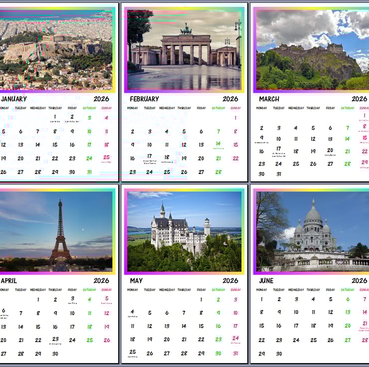 2026 A4 Calendar Europe Continent Landmarks