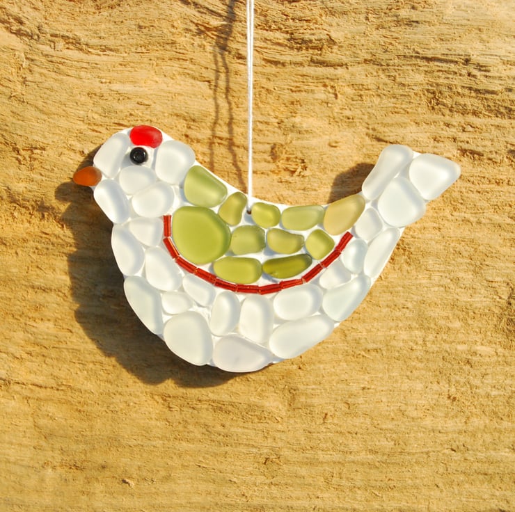 We've made this charming bird hanger from pieces of tumbled sea glass. The glass has come from old bottles, and the tumbling in the waves has rounded the pieces, giving them a three-dimensional effect. The back of the hanger is laser cut plywood.