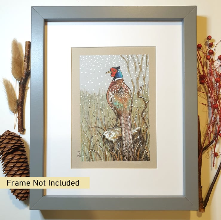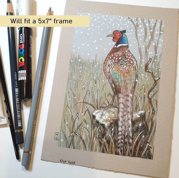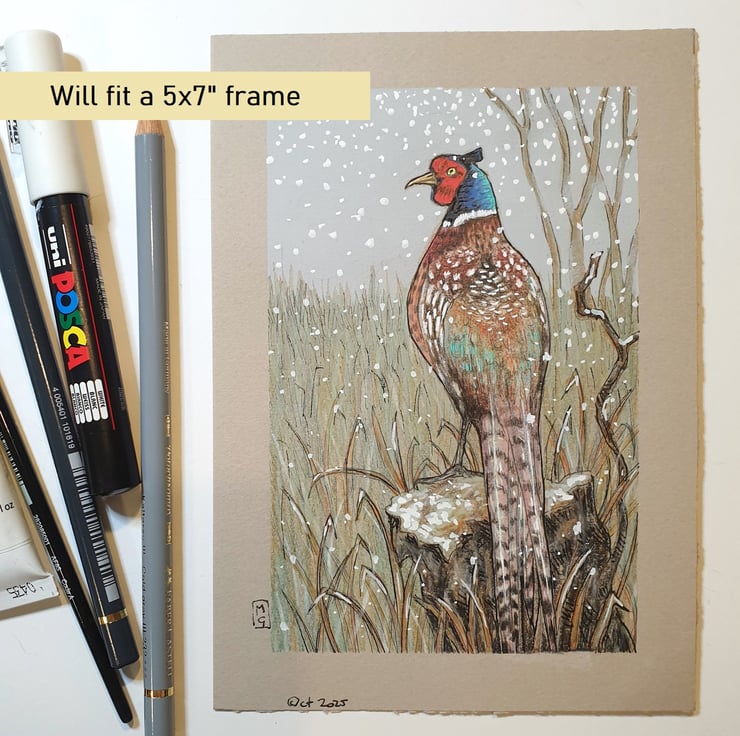 A small colour drawing of a pheasant in wintertime, with a grey sky and snow falling on a rural scene.