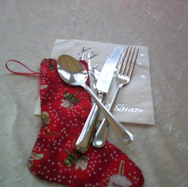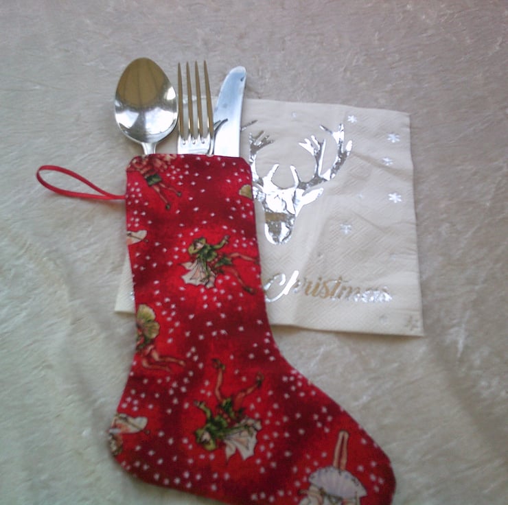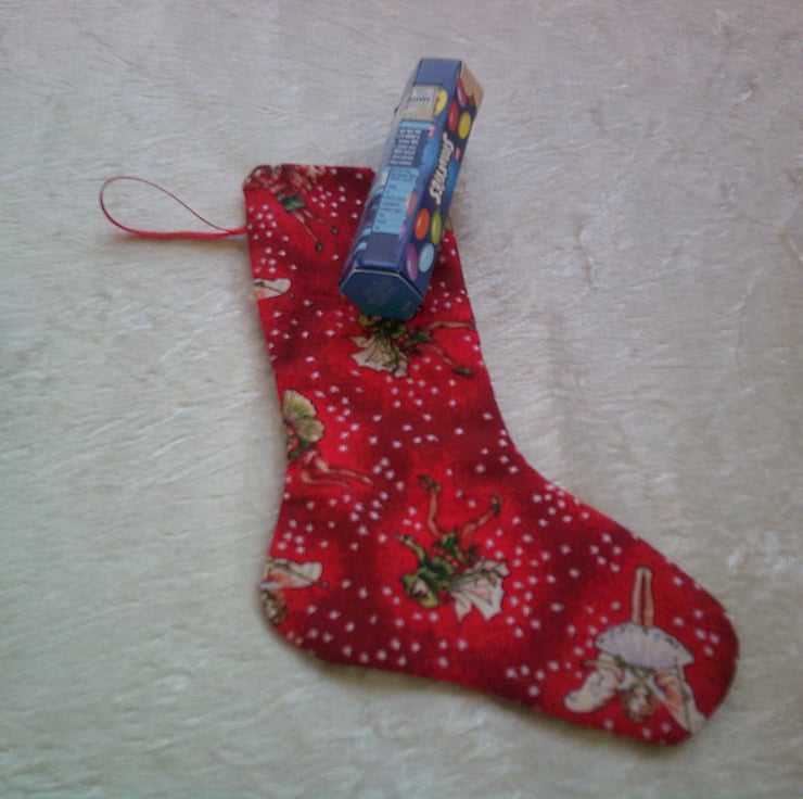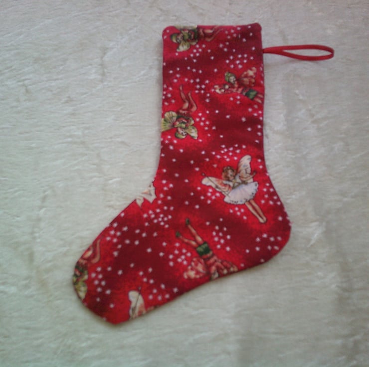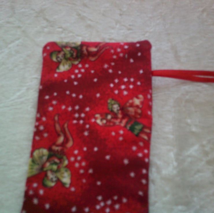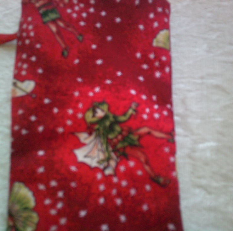 The fabric used is of Christmas Flower Fairies on a red background. The reverse side is the same design and it is lined with red fabric.