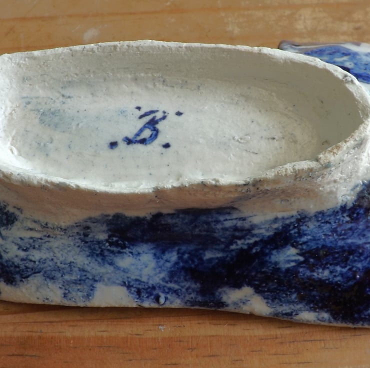 Hand-made using white clay and hand-painted with copper oxide, the artist's mark is on the reverse. Being hand-made to this level means no two will be the same.