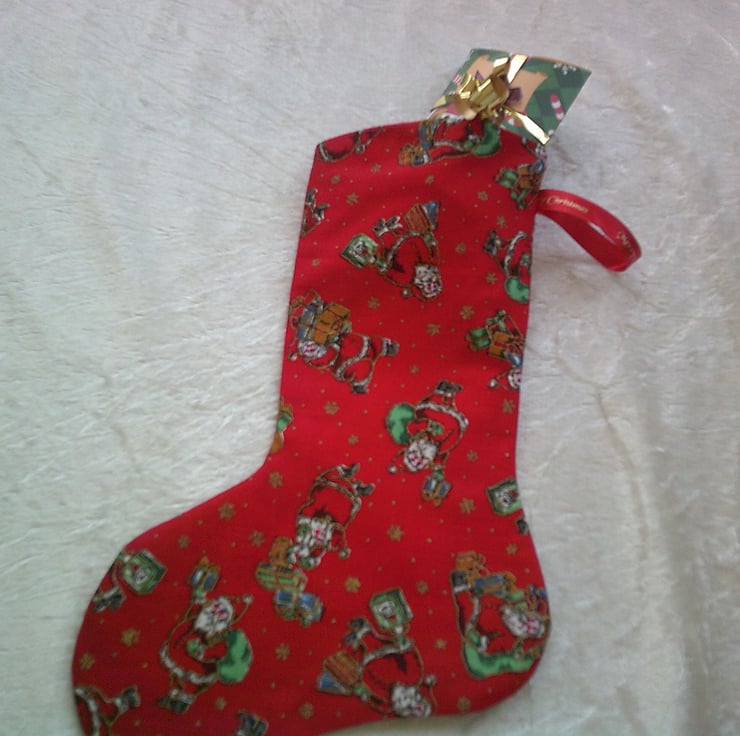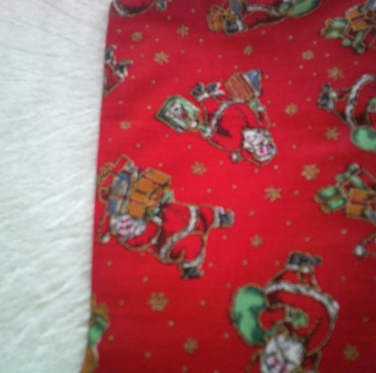 The fabric used is of Father Christmas with sacks and parcels on a red background, It is fully llined with red fabric..