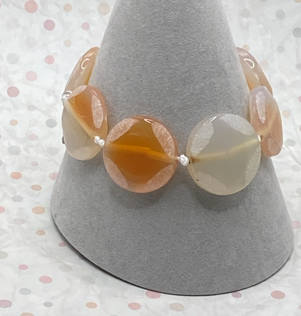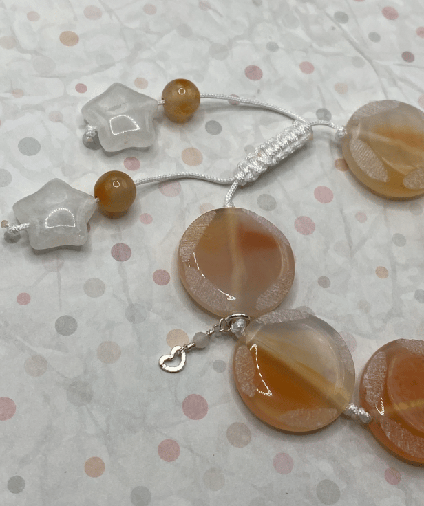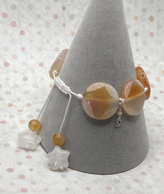 A chunky knotted white satin cord bracelet featuring smooth coin shaped stones of apricot agate, with smaller agate stones and white quartz stars on each cord end. A little silver plated heart and howlite stone charm dangles from the side for a perfect finishing touch.