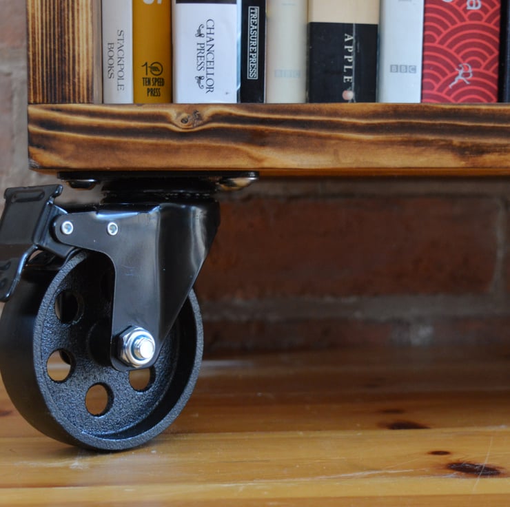 We hand select all our own timber and machine in house using traditional carpentry techniques. These Industrial units are made from Pine that we finish to a solid 3cm thick. The chunky wood is paired with rock solid, cast iron castor wheels for a great look