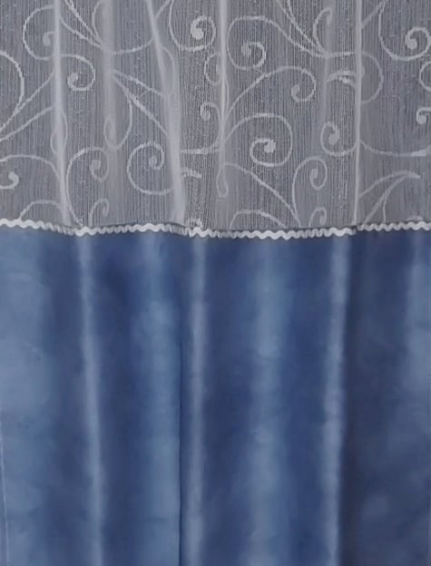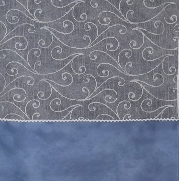 White loose weave net with a woven swirl pattern. The bottom is a mottled mid blue cotton. With a white ric-rac trim.