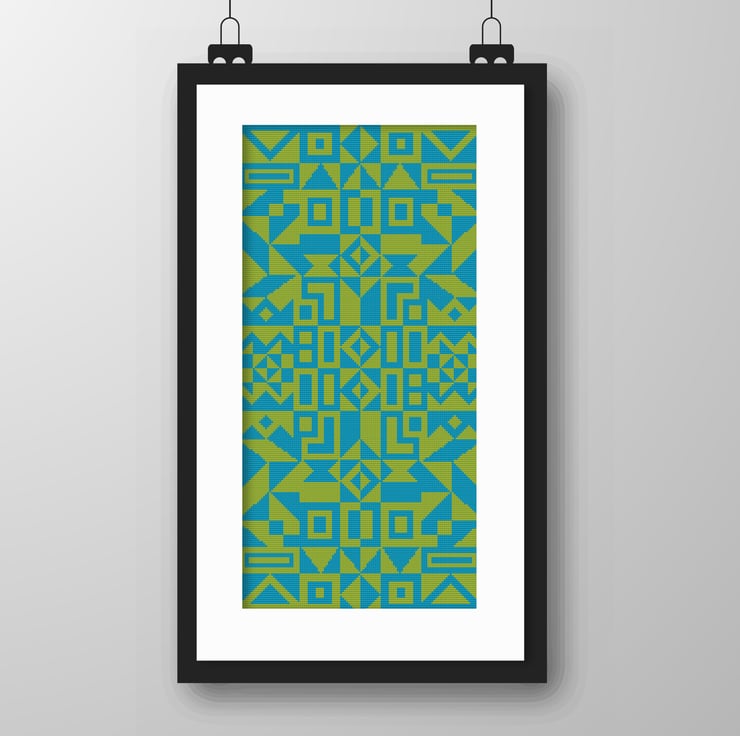 Easy Cross Stitch Pattern - Simply entitled 'Geometry' - A study of great designers - Alexander Girard Tribal Shapes - Modern Wall Art - PDF download counted chart Blue/green colourway 268B