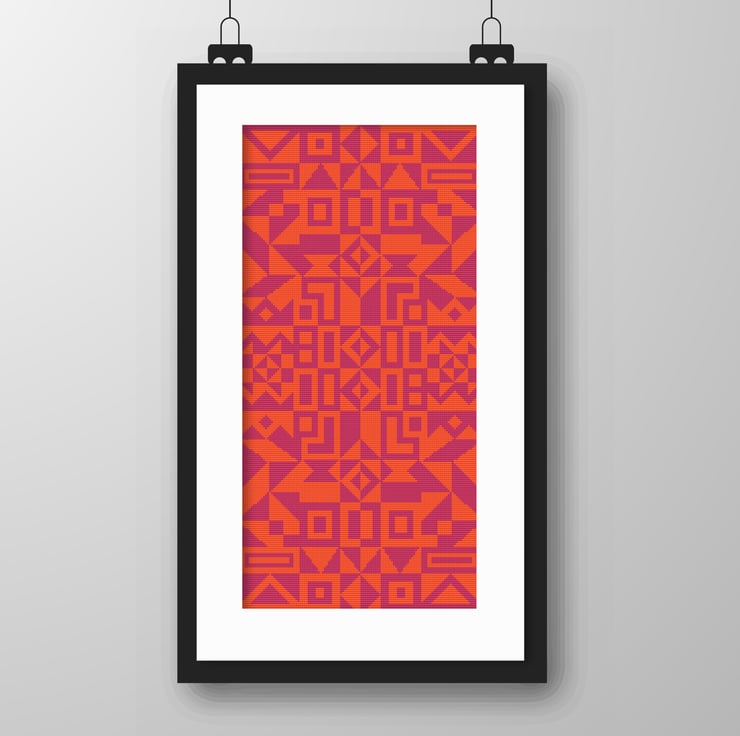 Easy Cross Stitch Pattern - Simply entitled 'Geometry' - A study of great designers - Alexander Girard Tribal Shapes - Modern Wall Art - PDF download counted chart Pink/Orange colourway 268C