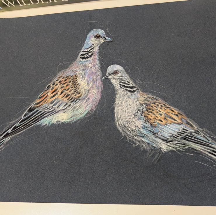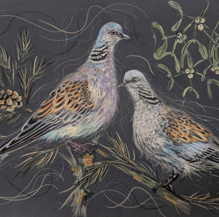 An open edition signed high quality print of an original drawing of a Two Turtle Doves. The original art work is mixed media. I used artists quality coloured pencils and pastels. Each print is professionally mounted in a textured white mount. It will be wrapped in cellophane and tissue and posted in a sturdy box.
