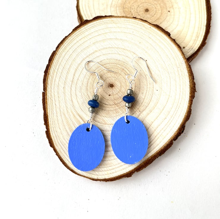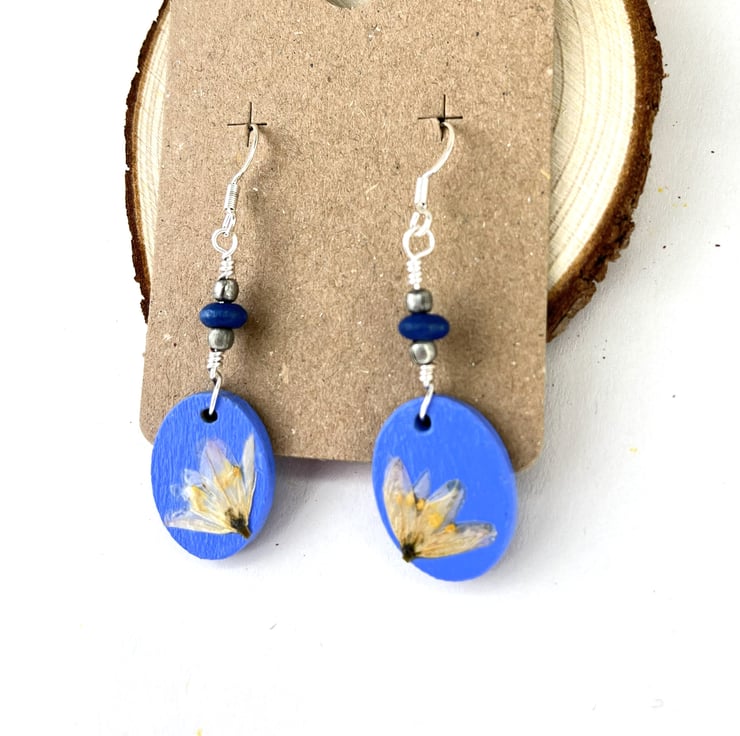 These lovingly handmade dangle earrings are made using hand painted wooden ovals with real pressed allium flowers grown in our garden in Hampshire. Finished with a water based varnish.