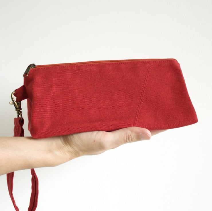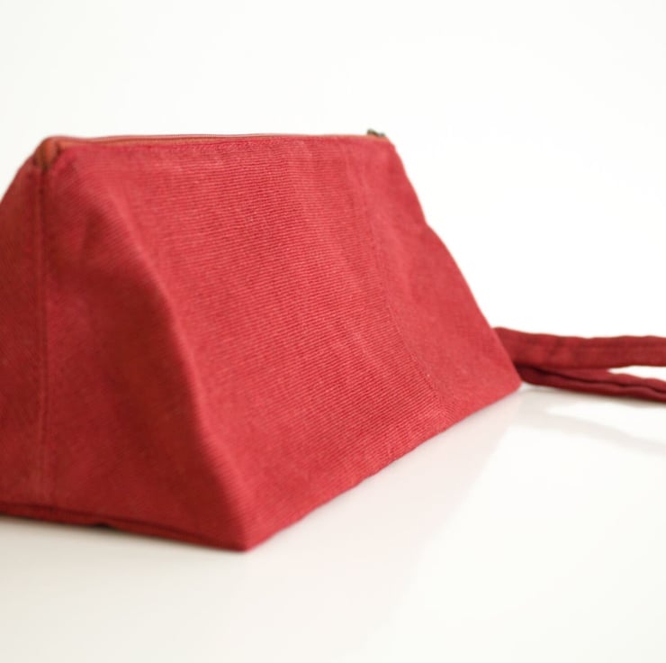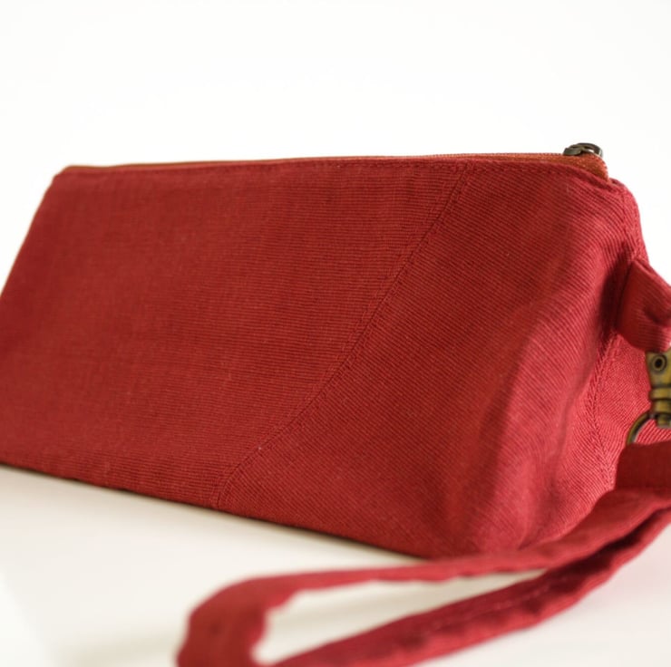 This pouch has a zipper opening and a detachable handle to convert into a wrislet. It is made from red 100% organic ribbed cotton and lined with a cotton twill. Now, there are six different lining colours and three metal hardware colours to create your own custom pouch. Simply select your custom features from the dropdown menus.