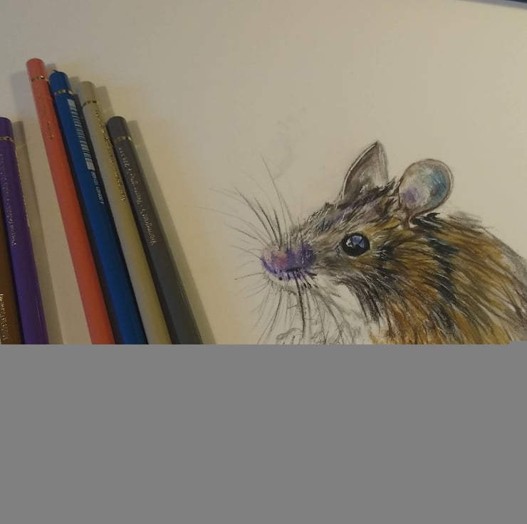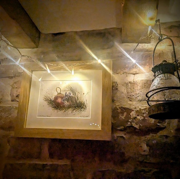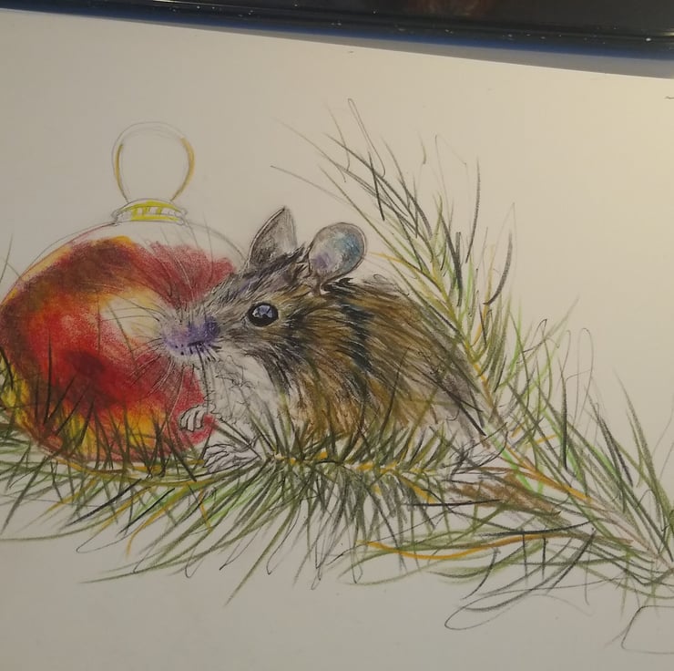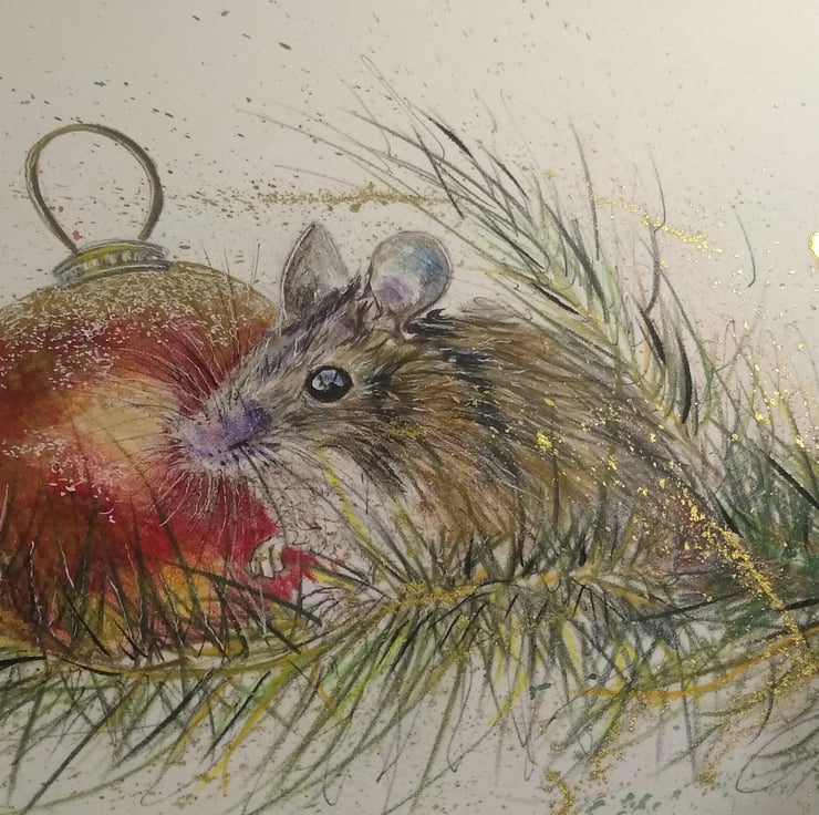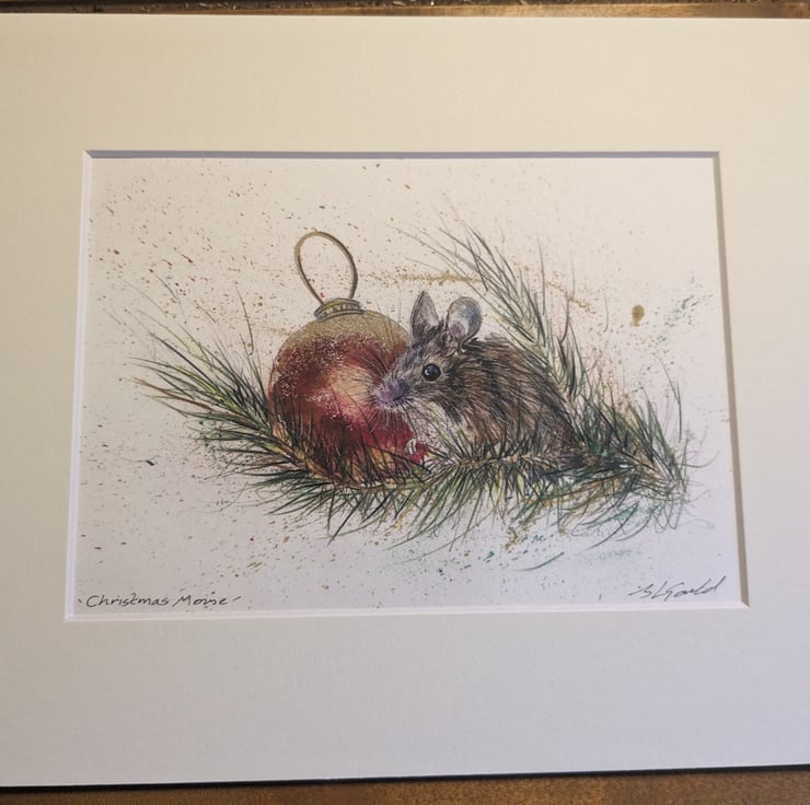 A signed high quality print of an original mixed media painting of a mouse and a Christmas bauble. The original was painted with watercolour. I then used polychromos artists colouring pencil with drawing inks and finished with some ink and paint splashes. Each print is professionally mounted and cellophane wrapped.