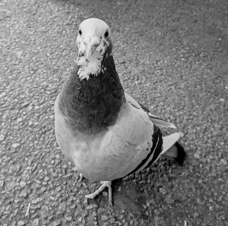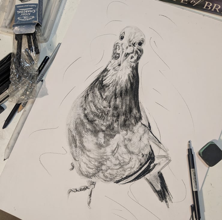 A high quality signed print of an original charcoal drawing of a pigeon . In a choice of a black or textured white mount. Each print is professionally mounted and cellophane wrapped. It will be posted wrapped in tissue and protected in a reinforced envelope.