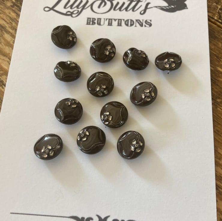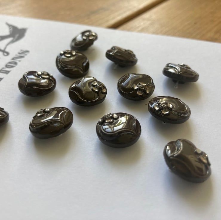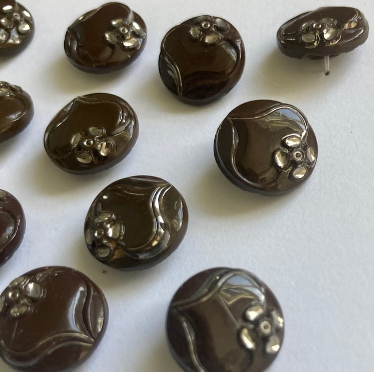 12 Vintage Czech Glass Brown and Silver Buttons - 14mm, these are a lovely chocolate brown colour with silver flowers, gorgeous, would look amazing on a blouse!