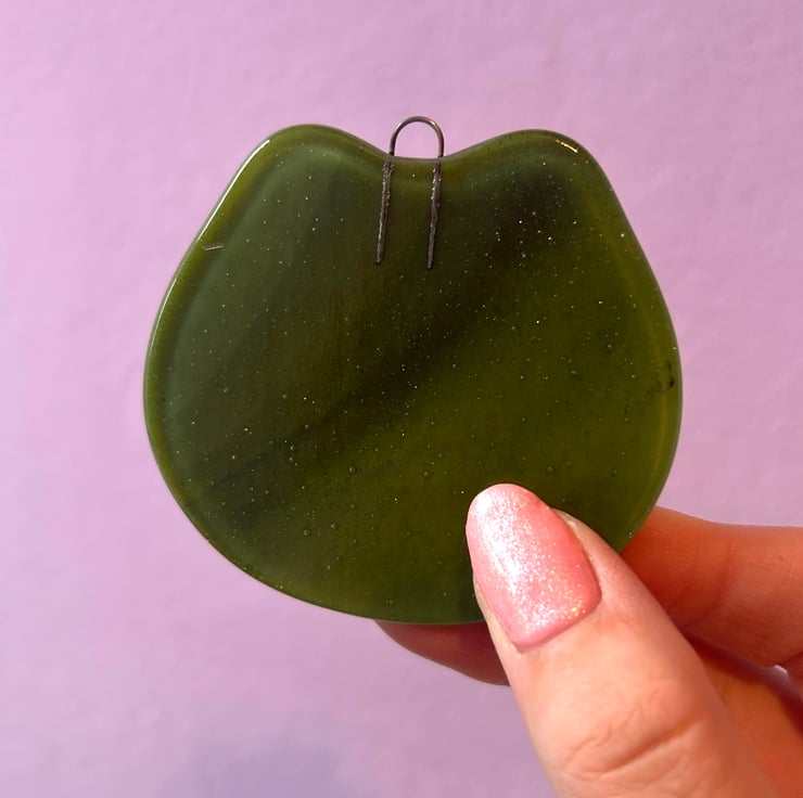Made from deep green glass with a soft shimmer, this one features a hand painted face giving the perfect side eye.