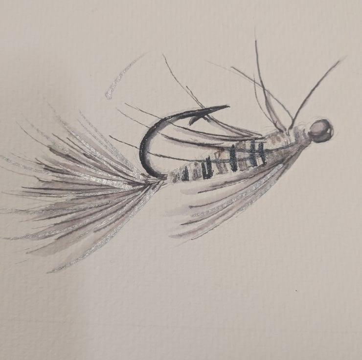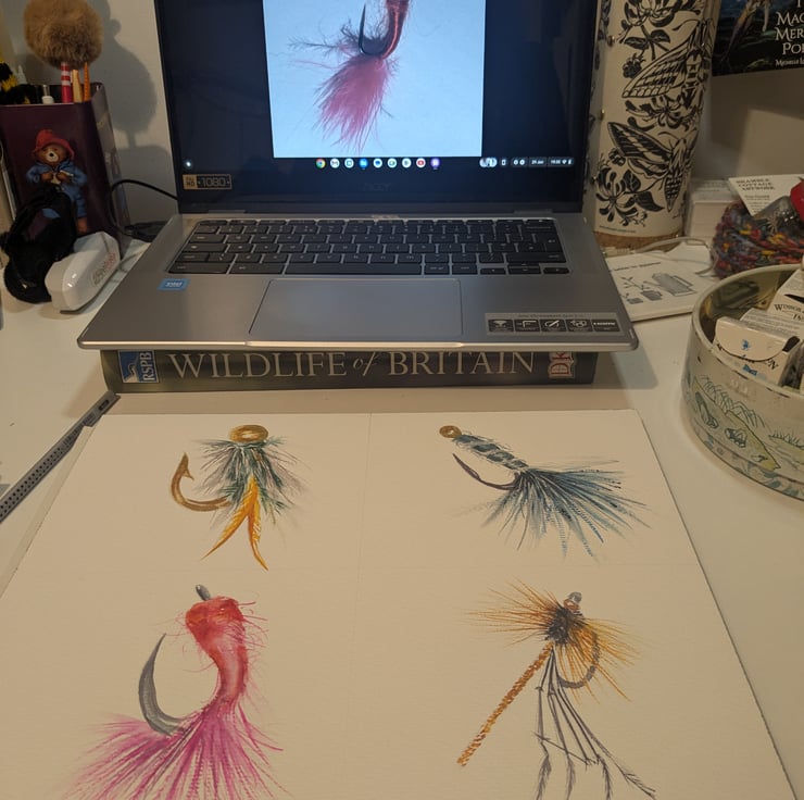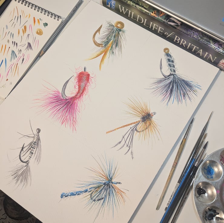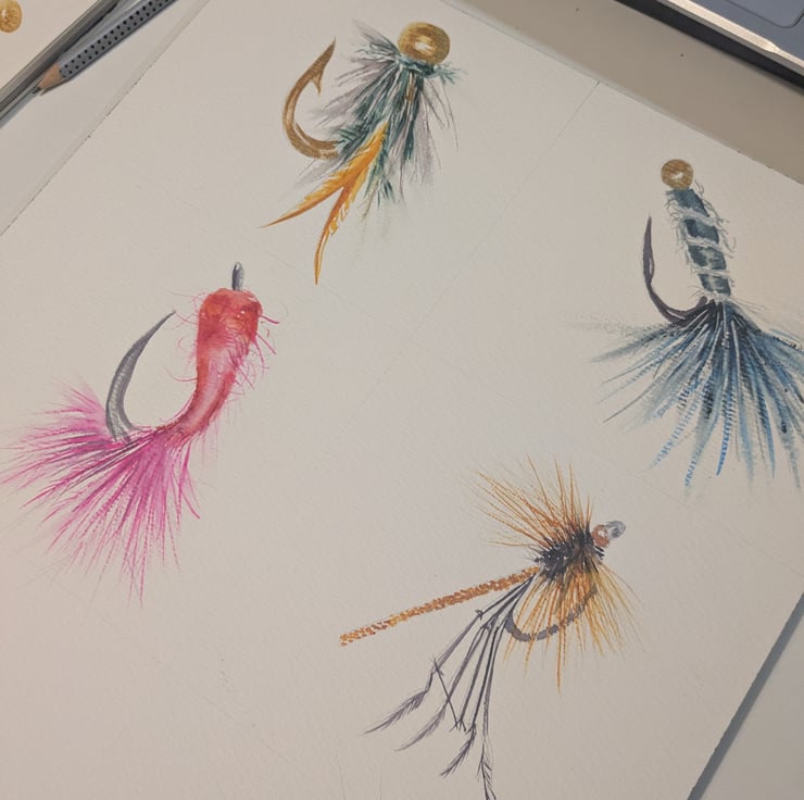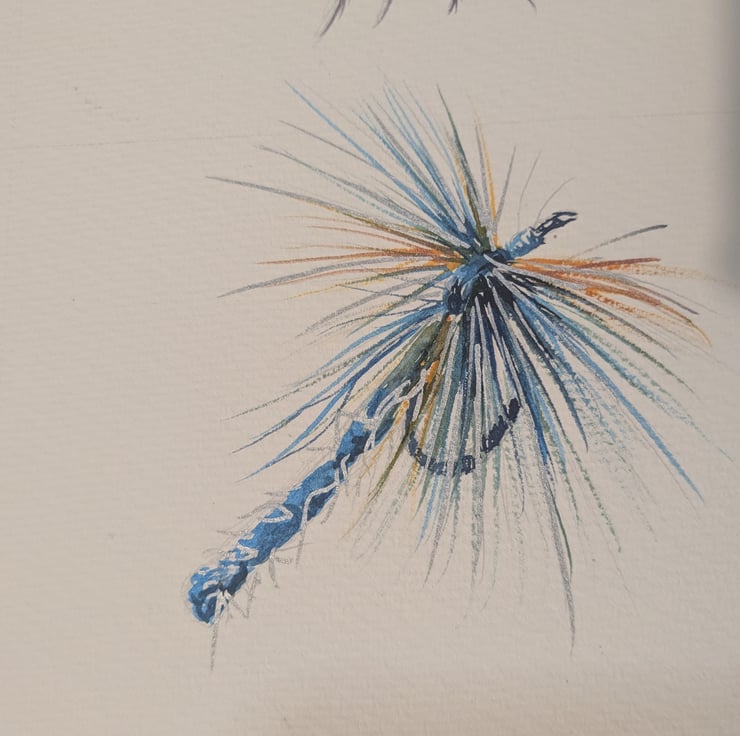 Making fishing flies is an art in itself! These are a selection belonging to a friend of mine. I took photos of them but had to magnify them to see all the tiny details. The colours are all accurate (and what beautiful colours they are!) but as I often do I've used a bit of artistic licence and added my own style.
