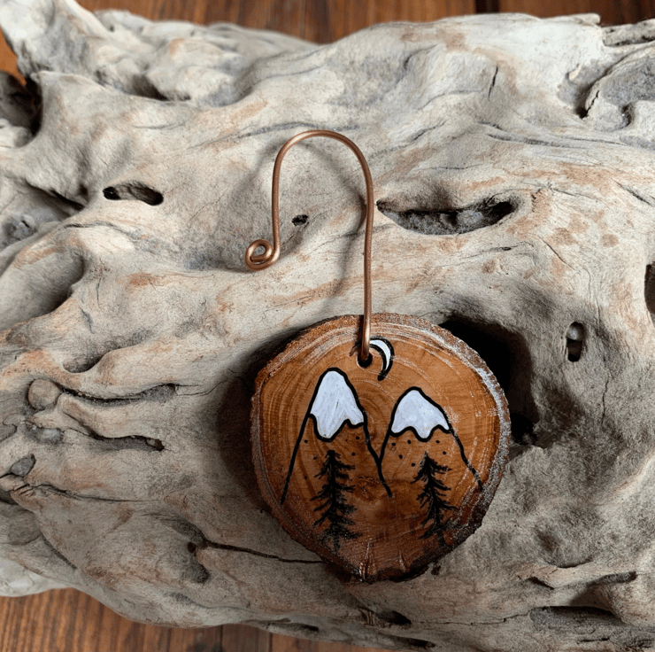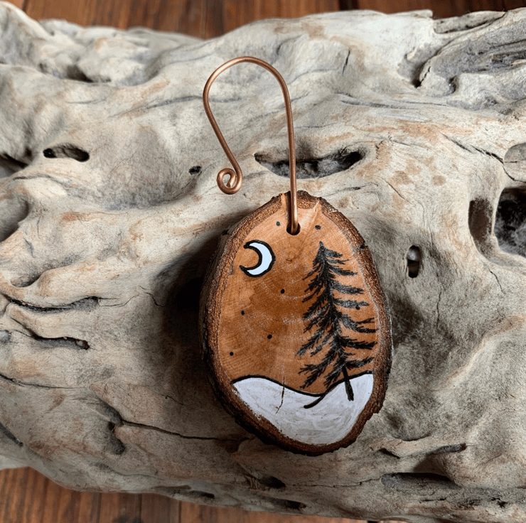 Wooden Christmas decoration, with copper hanging wire, rustic homeware