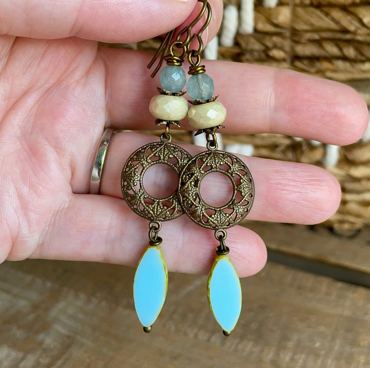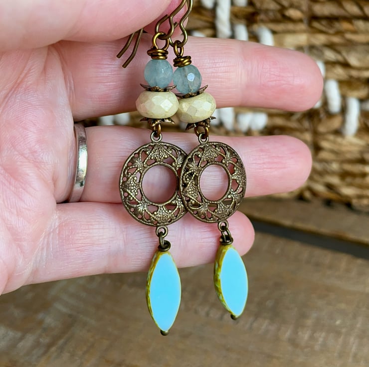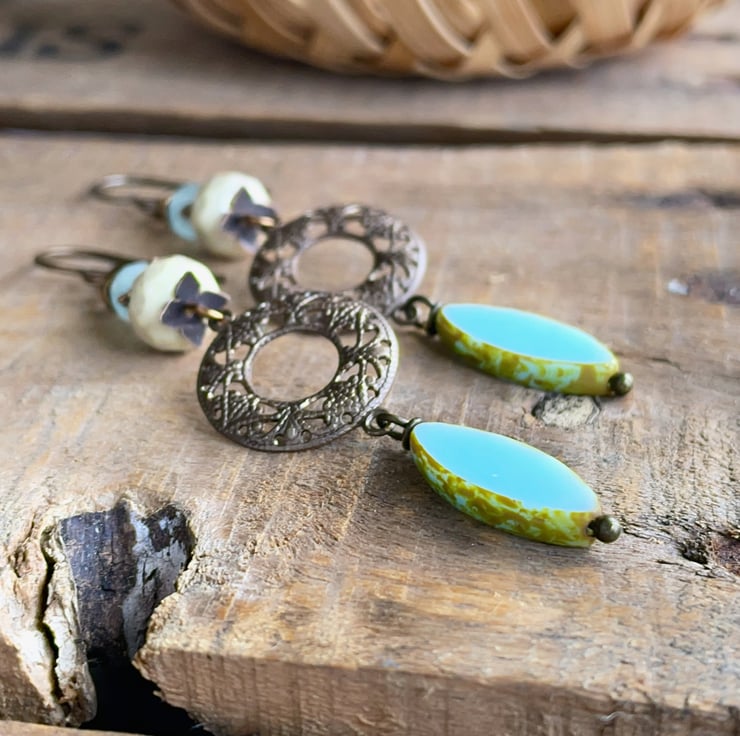 These earrings are lightweight and comfortable for everyday wear. Finished with small Vintaj brass French hooks, they measure approximately 6 cm from the base of the earwire and 7 cm total length.