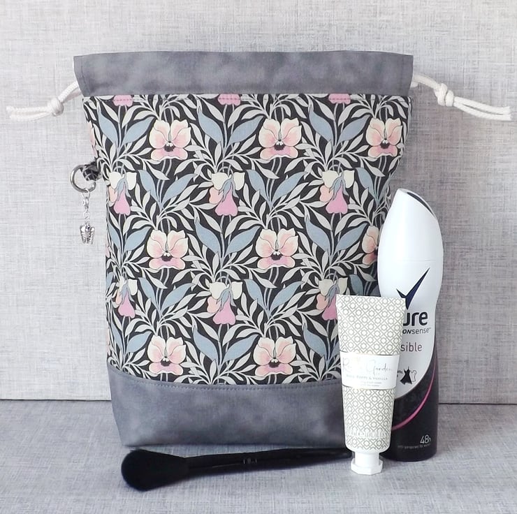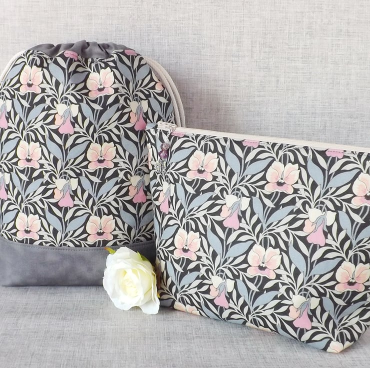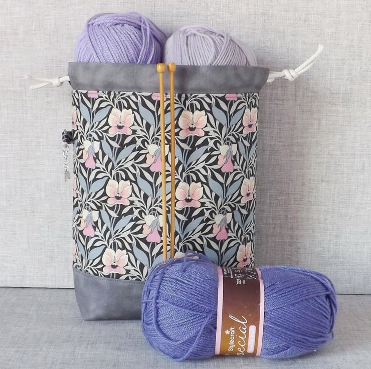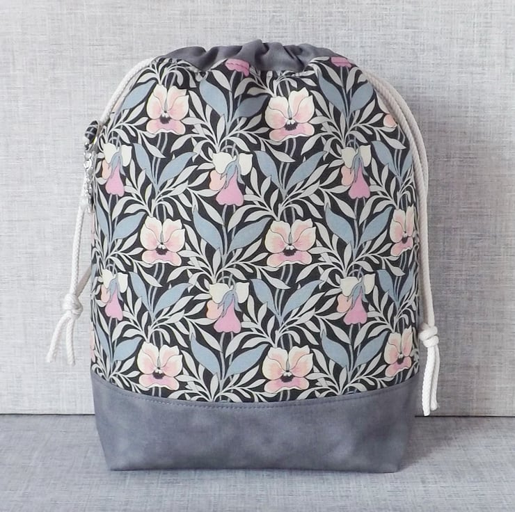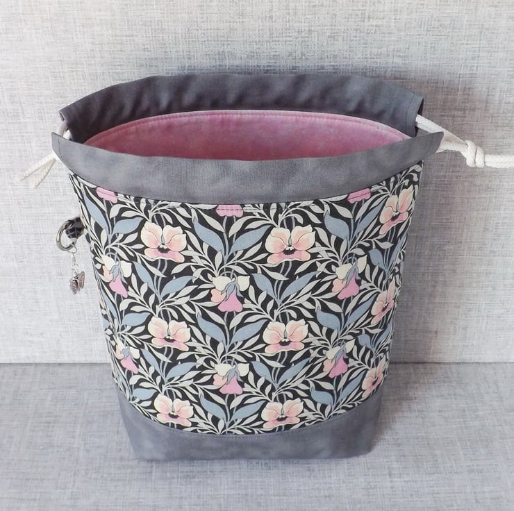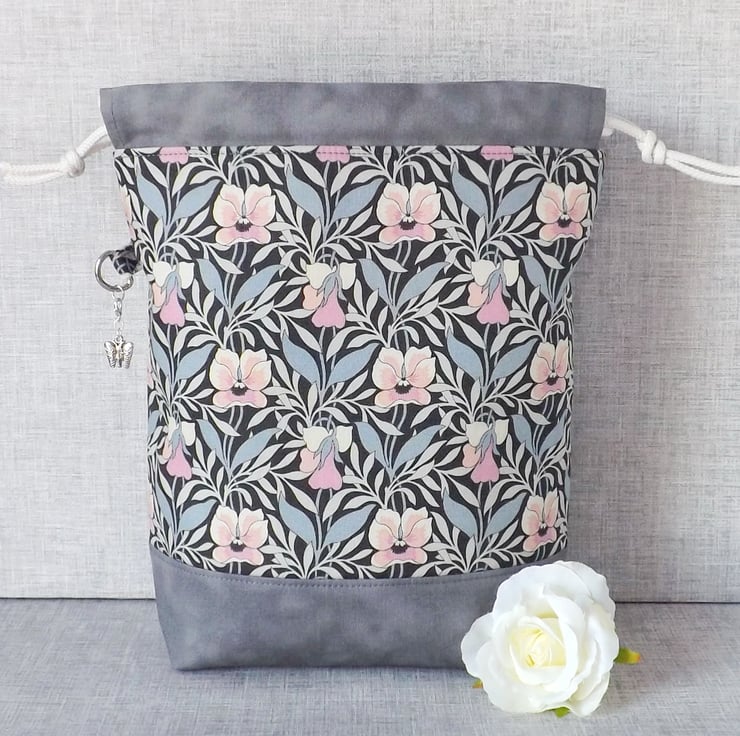 A project bag, drawstring bag, made from a lovely cotton fabric. The main fabric is Liberty 'Harriet's pansy' from their Hesketh House range of quilting weight cotton, in shades of grey, cream and pink, combined with a tonal grey fabric. The lining fabric is a pink tonal cotton.