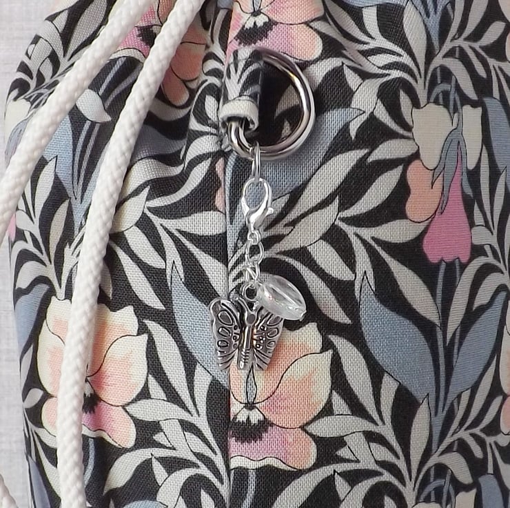 I have included a butterfly & heart charm/stitch holder which is attached to a D ring on one side of the bag, and the bag closes with drawstrings.