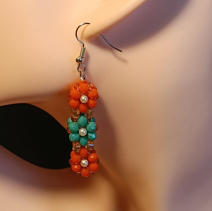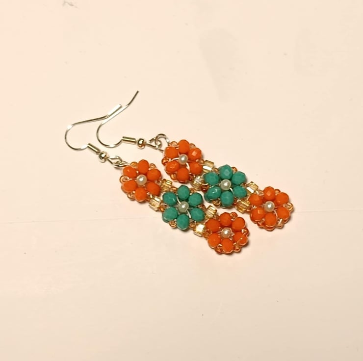This unique piece is made of 4mm orange crystal beads , 4mm teal crystal beads , 3mm white pearl beads , 3mm golden square shaped crystal beads and 1mm orange glass beads . There are 6 flowers in each earring .