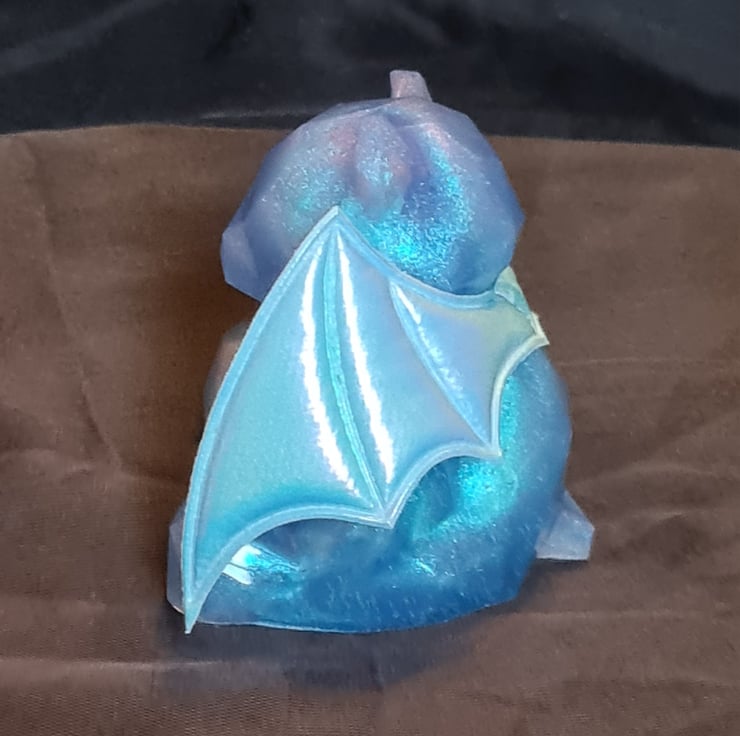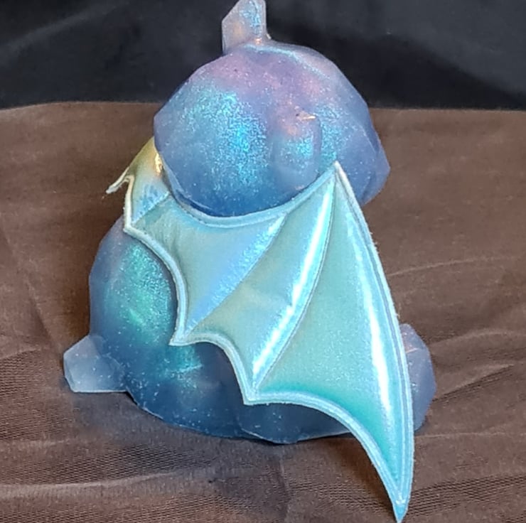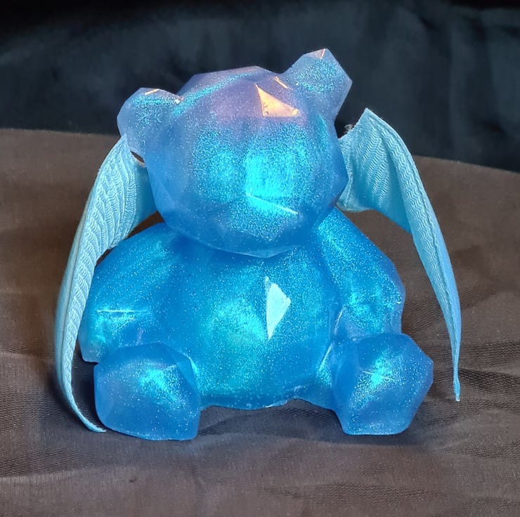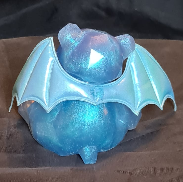 A creepy-cute geometric, handmade, resin Bear figurine. In Shimmery Blue resin with Blue Shimmery fabric Bat wings. An unusual and unique keepsake gift.