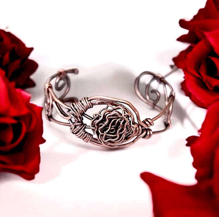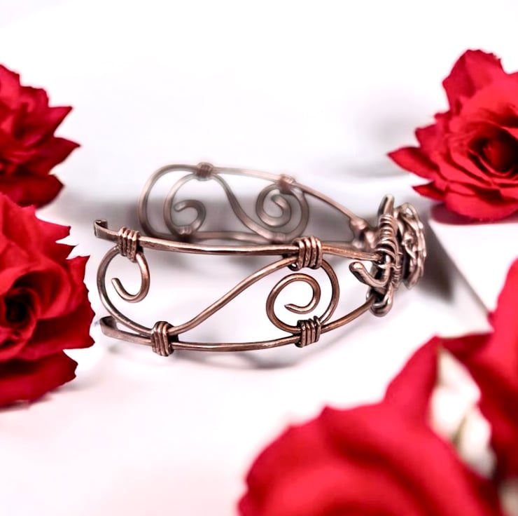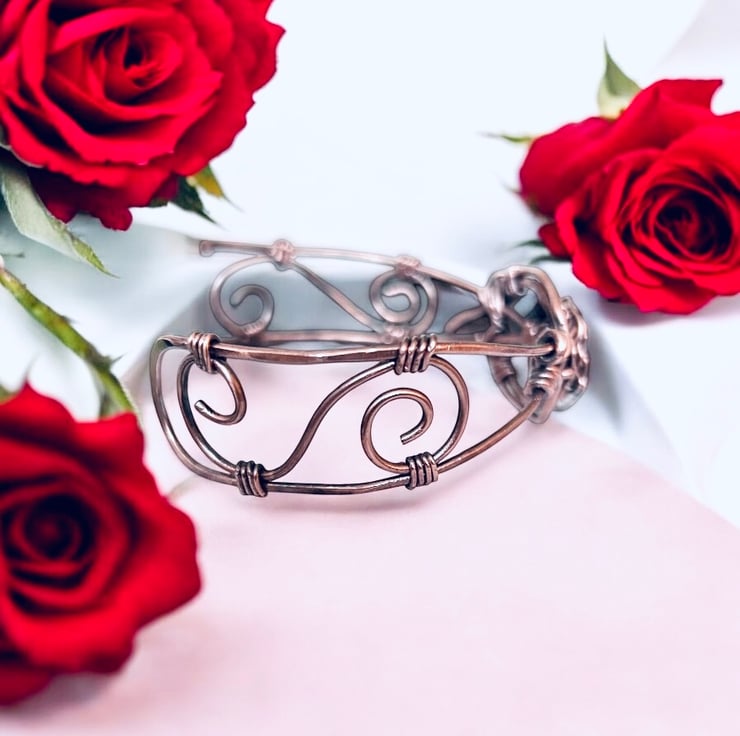 This is a very eye catching cuff bangle and will be bespoke to you. The design incorporates a wire wrap flower set on a copper wire leaf with ornate scrolls on the side of the bangle. To oxidise the copper I use a liver of sulphur solution and submerge the bangle for a approx 60 seconds, I then remove the copper from the solution and thoroughly clean and polish, this gives the copper a beautiful patina with lighter and darker shades. Suitable and robust enough for everyday wear as it is made with 1.5mm Gauge Solid copper and will last a lifetime.