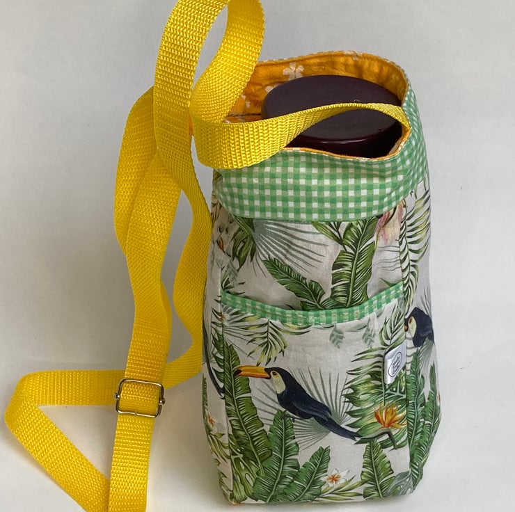This lovely water bottle bag is made from lightly quilted, quality cotton fabric and is designed to be worn across your body. The main fabric is white with a green tropical pattern, showing leaves and birds. The lining is yellow and the decorative trim is a green check. The strong yellow strap is more than able to take the weight of a full water bottle without stretching and the length is adjustable to suit your height. With no fastenings, your drink is easily accessible whilst being held safely upright.
