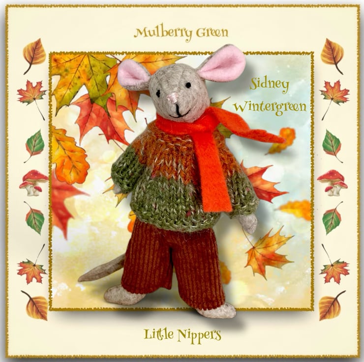 Sidney Wintergreen, in his soft rust and olive green jumper, rust corduroy trousers and orange scarf is one of the Little Nippers - tiny mice who live in a maze of tunnels underneath the barn at Mulberry Farm. All of the Little Nippers are named after herbs and meadow flowers. The Little Nippers are 14cm tall. Clothes made especially to fit them are also available in my shop.