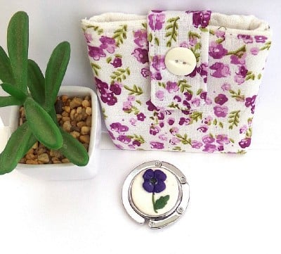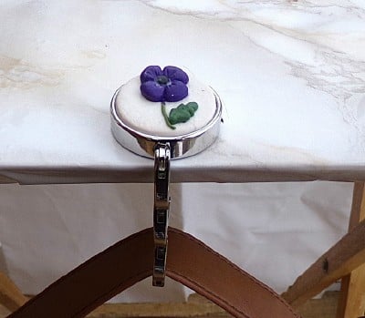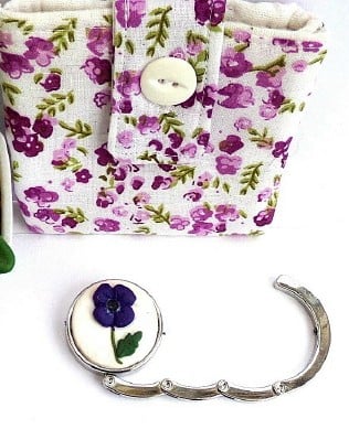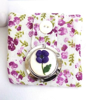 A handcrafted bag hanger that comes with it's own little pouch. It features a purple poppy on a ivory cream background that I have handcrafted from polymer clay. It is useful and practical , you just place it on the table with the hook down to place your bag close to you and keep the bottom of your bag clean. It comes with it's own little hand made pouch in a purple and white floral polyester cotton print .