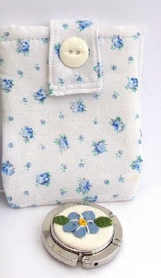 A handcrafted bag hanger that comes with it's own little pouch. It features a blue forget-me-not flower on a ivory cream background that I have handcrafted from polymer clay. It is useful and practical ,you just place it on the table with the hook down to place your bag close to you and keep the bottom of your bag clean. It comes with it's own little hand made pouch in blue and white floral polyester cotton...
