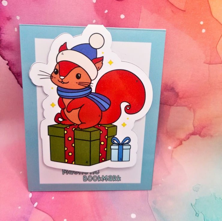 Christmassy, winter-themed Squirrel, glossy Magnetic Bookmark. Cute Squirrel in a winter theme. Printed on glossy photo paper and laminated for additional protection. Weatherproof, tear-resistant and durable. Featuring the same design on the front and back, allowing you to flip the orientation of the design. Approximately 2 x 2.5 in.