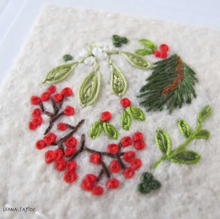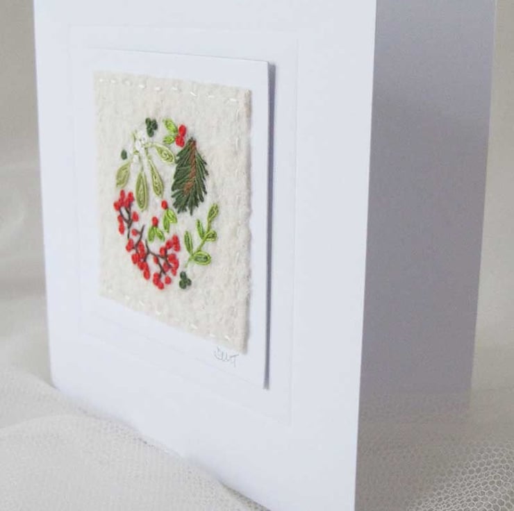 HAND EMBRODERED CHRISTMAS CARD WINTER FOLIAGE