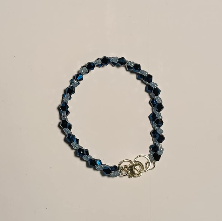 This unique piece is made with 4mm metallic blue bicon beads which are separated by 1mm light blue glass