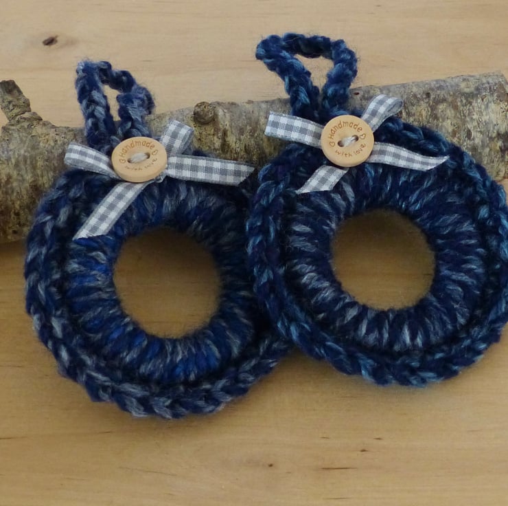 This listing is for two mini crocheted hanging wreath decorations. They have been made with a chunky variegated Navy Blue yarn and have grey gingham bows and natural wood buttons for decoration. The buttons have the words 'Handmade With Love' on them.