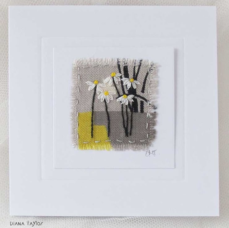 This beautiful card has been embroidered by hand onto a piece of genuine 1950's fabric. The embroidery design is of daisy style flowers in white and yellow on a black, grey and yellow patterned background. Perfect for a special occasion, it has been left blank for your own message. The embroidery has been mounted on card and then mounted onto the card base with an embossed frame around it.