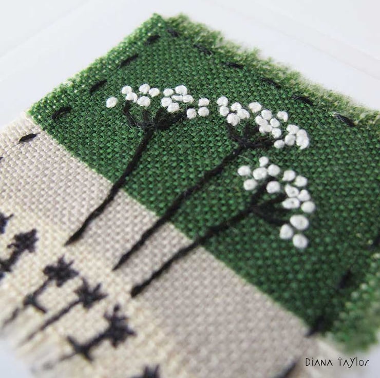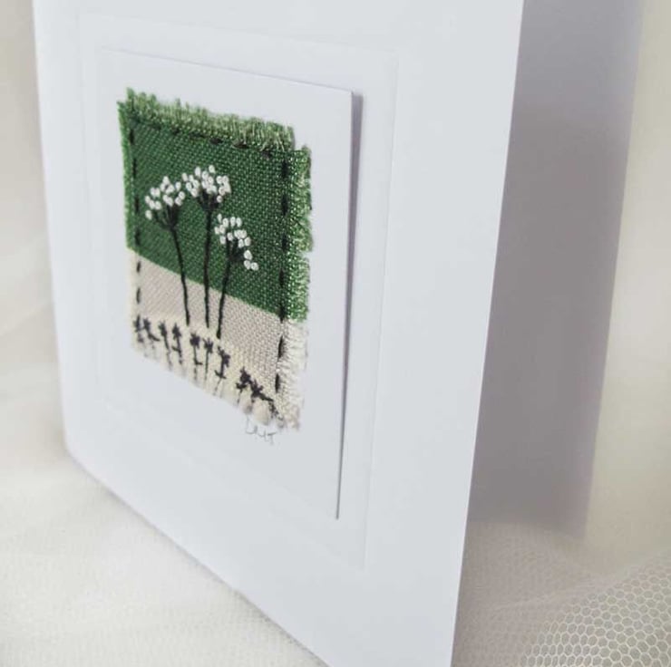 This beautiful card has been embroidered by hand onto a piece of genuine 1950's fabric. The embroidery design is of umbellifer style flowers in black and white on a deep green, black, grey and white patterned background. Perfect for a special occasion, it has been left blank for your own message. The embroidery has been mounted on card and then mounted onto the card base with an embossed frame around it.