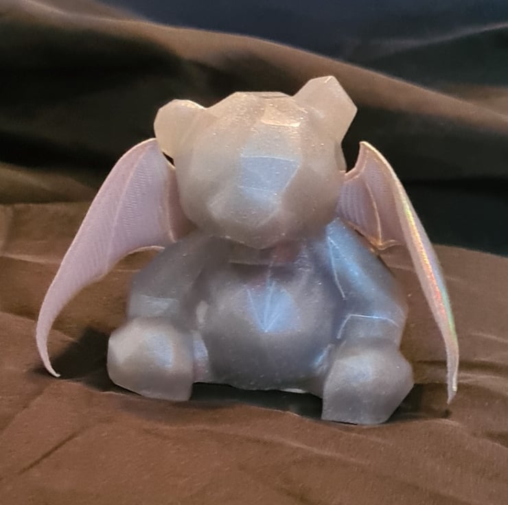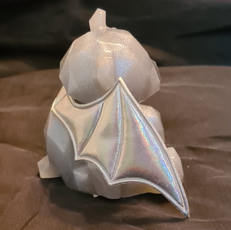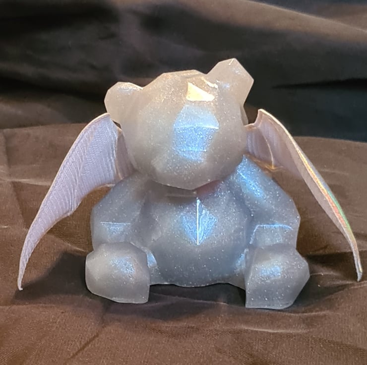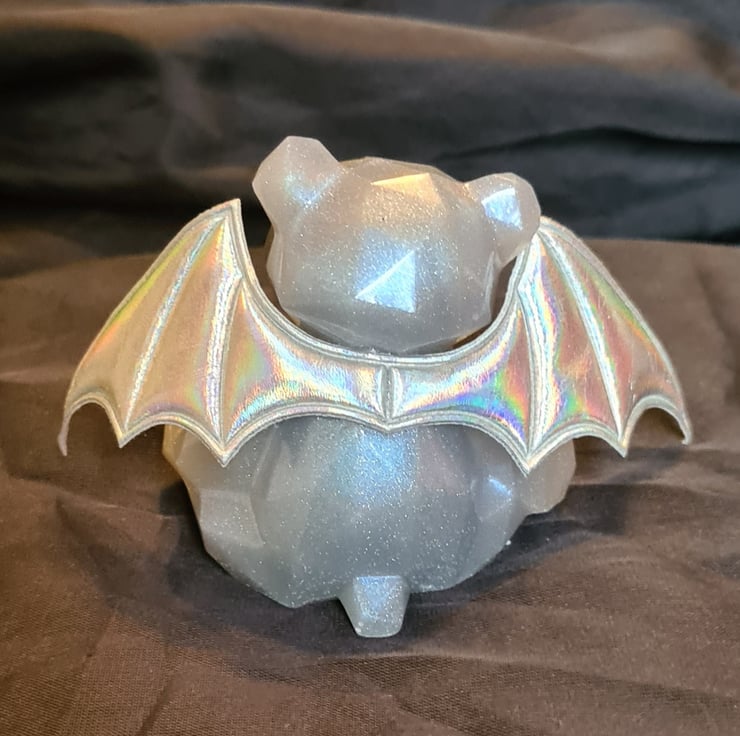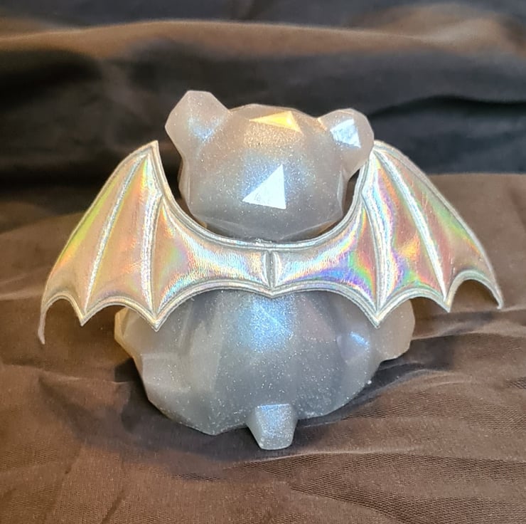 A creepy-cute geometric, handmade, resin Bear figurine. In shiny Silver Grey resin with shiny Silver fabric Bat wings. An unusual and unique keepsake gift.