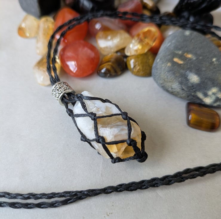 Handmade macramé necklace with large citrine point. Interchangeable with other crystals you have in your collection. Simply slide the bead up, and swap the clear quartz for another, depending on which you are drawn to that day. Using that healing intuition!