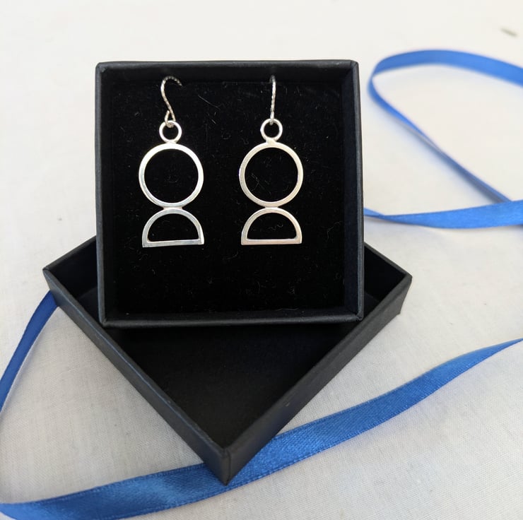 A unique pair of sterling silver geometric earrings with sparkly hook wires. This is a one off pair, the item pictured is the one you will receive. Delivered in a gift box with tracked postage. Handmade in Sheffield from solid recycled sterling silver.