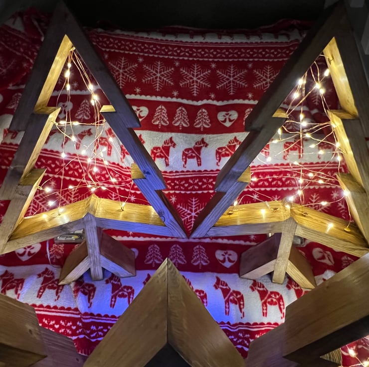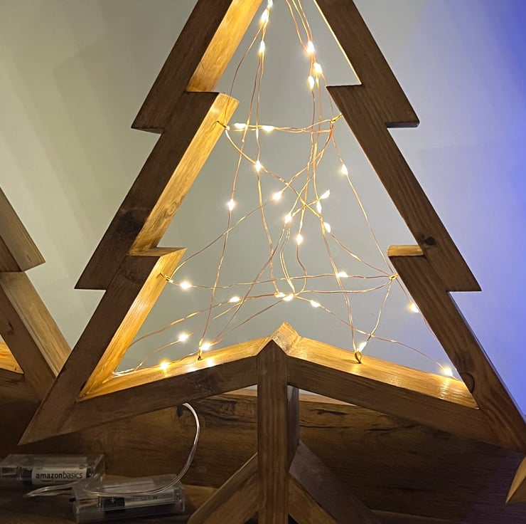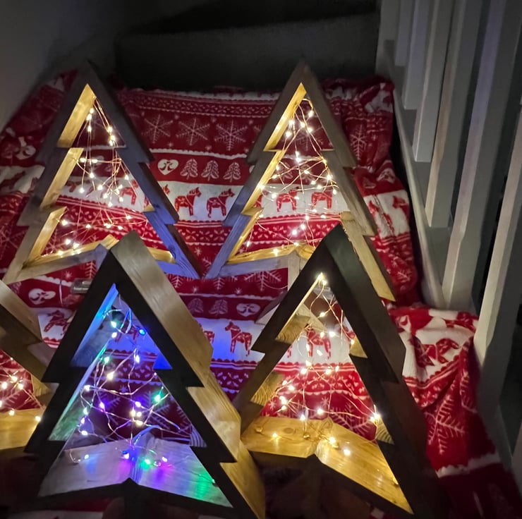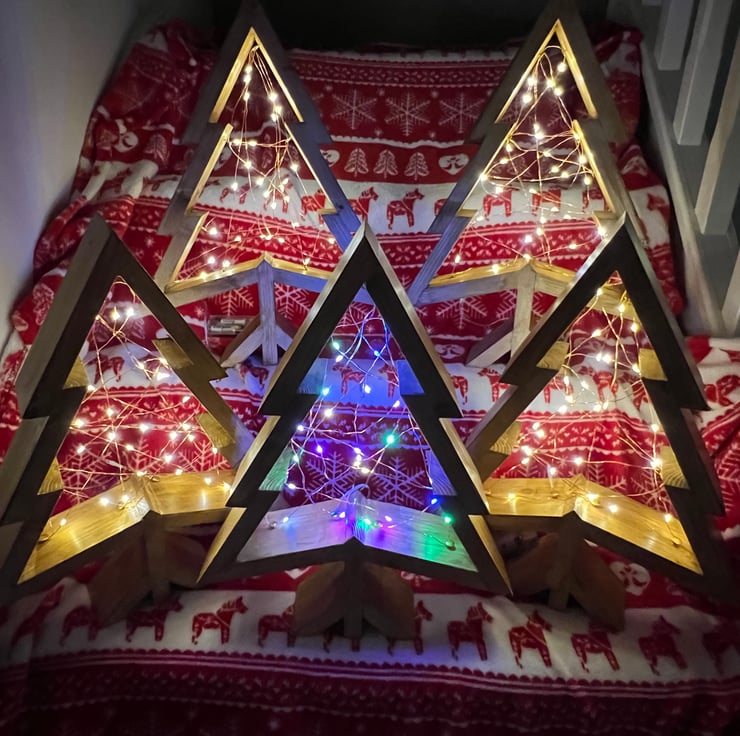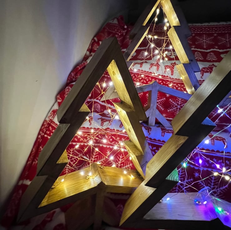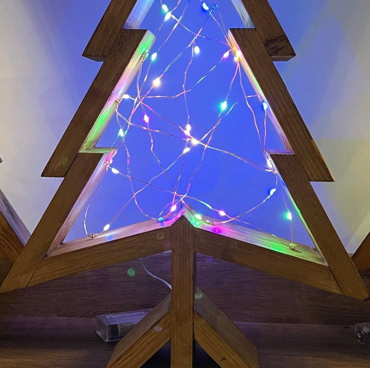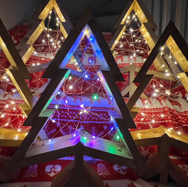 Hand made wooden Christmas tree with either white or coloured led lights. Tree measures approximately 400mm high by 320mm wide and 65mm deep. The tree is stained in dark oak but if you would like other colours please contact me.