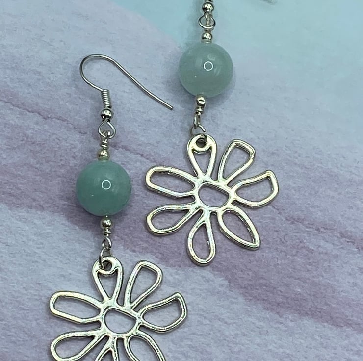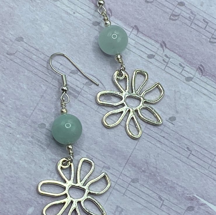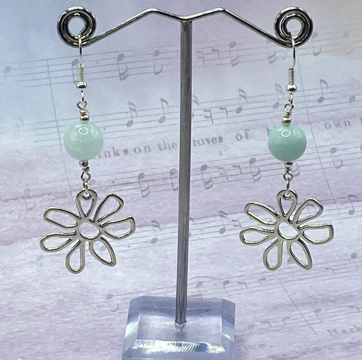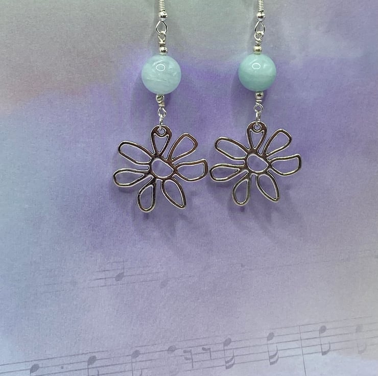 A pair of retro style earrings made from silver tone flower charms, topped with 10mm amazonite stones. Everything's linked together using silver plated copper wire and matching earring hooks.