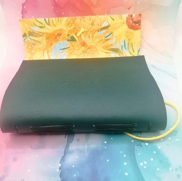 Beautifully hand-bound journal using dark green leather and colourful paper internally. Style up your stationary game with these hand-bound journals, perfectly sized (approximately A6) to fit in a pocket or small bag. Complete with a faux leather cord to hold your journal shut.