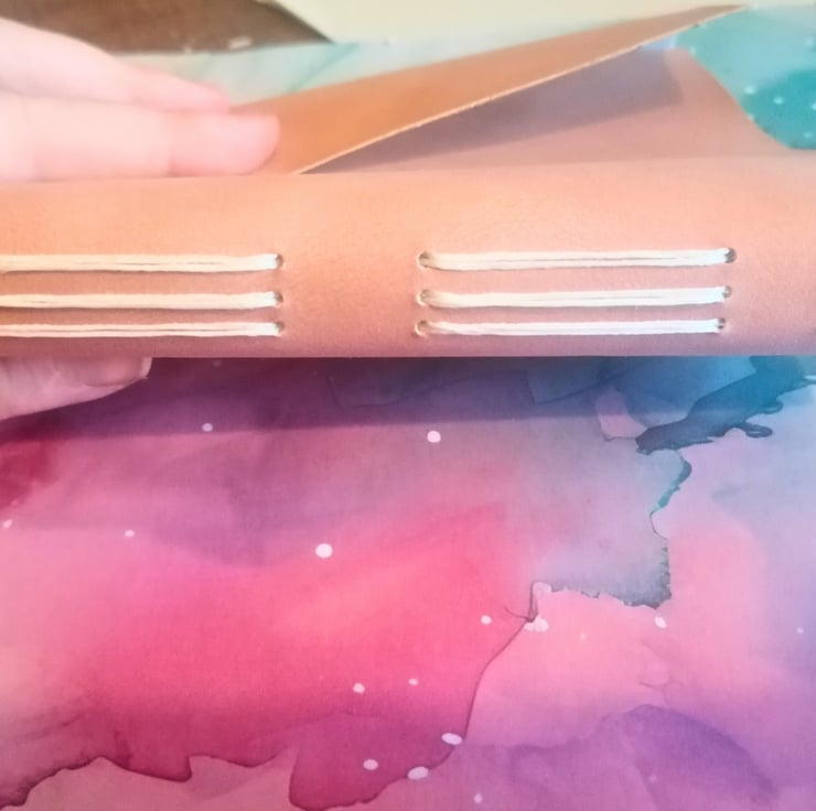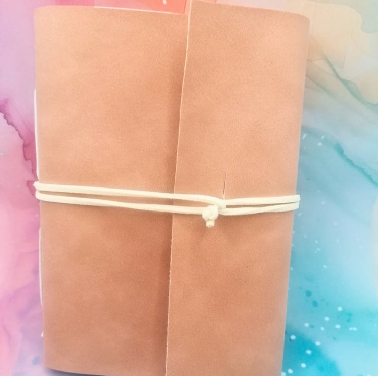 Beautifully hand-bound journal using a tan Faux leather and colourful paper internally. Style up your stationary game with these hand-bound journals, perfectly sized (approximately A6) to fit in a pocket or small bag. Complete with a faux leather cord to hold your journal shut.