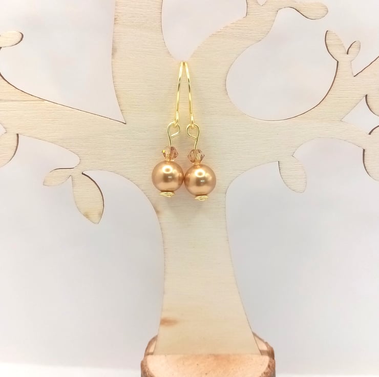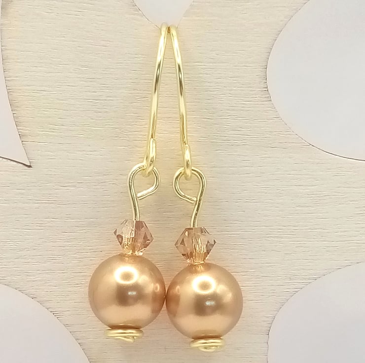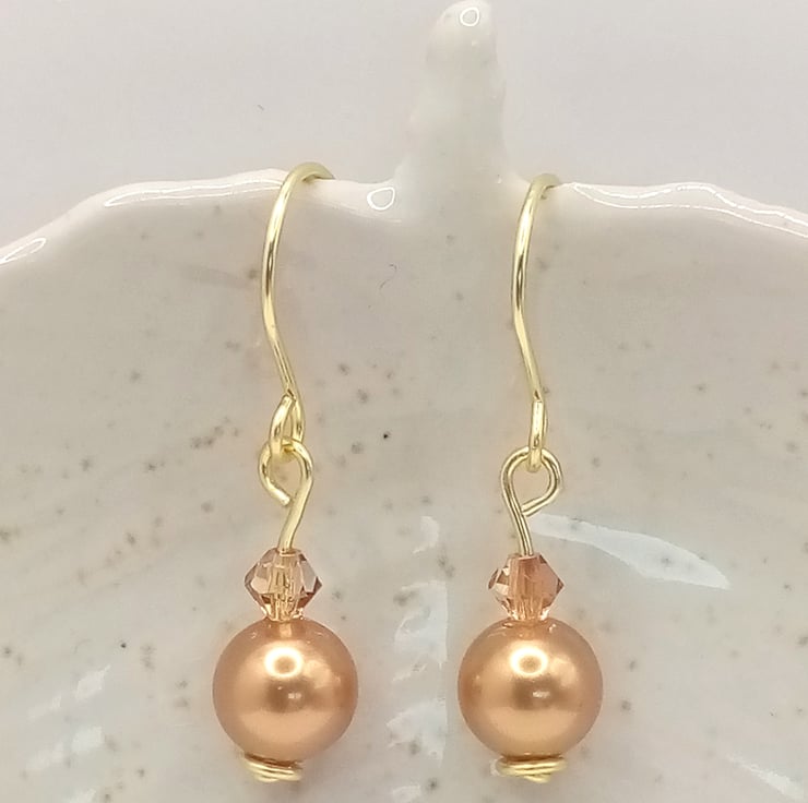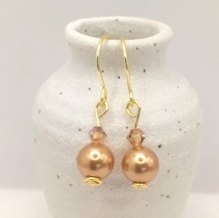 These Swarovski pearl earrings are made using 8mm Swarovski crystal elements pearl beads topped off with a 4mm Czech crystal Bohemica bicone bead in celsian colour.